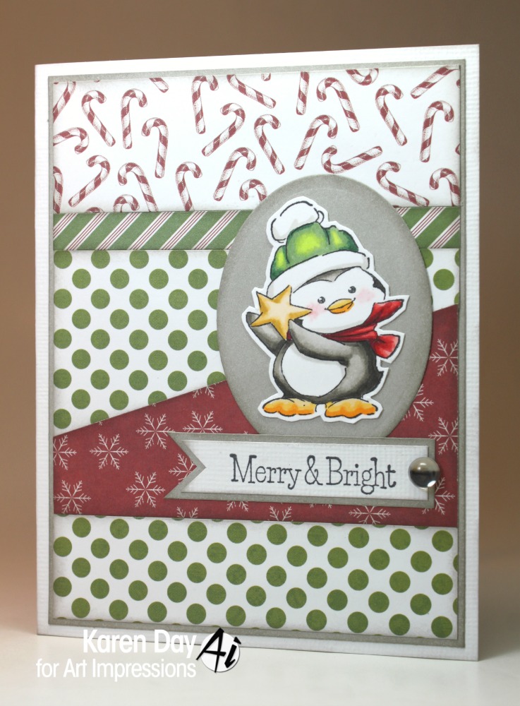 Patterned papers are Candy Cane by Teresa Collins; Cardstock is Whisper & White Daisy, CTMH; Ink is Memento, Tuxedo Black; Copic Markers; Stamp set is Christmas Cheer Set (Sku #4666) and sentiment is Holly Jolly Set (Sku #4667) - both Art Impressions.