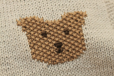 Just straight knitting & purling, but it was the first time that I've done intarsia (for each teddy, you switch balls of yarn, the colours are not carried across the back of the blanket) which was a learning curve! And after blocking, I embroidered on all the little faces. I loved it when his Mom sent me photos of him enjoying his new blanket!