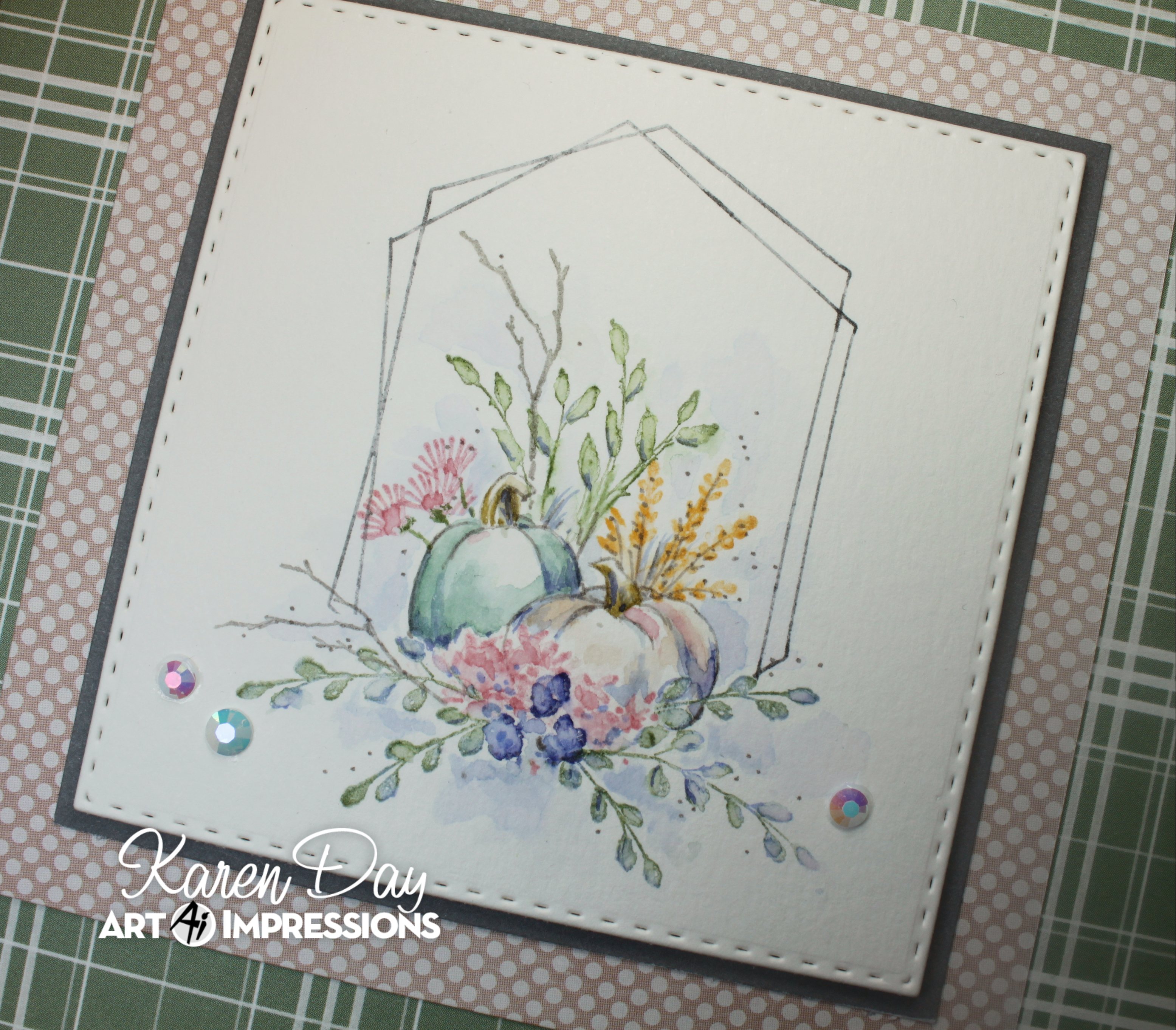 I have a fall image today using a non-traditional colour scheme for the upcoming Watercolour Weekend post on the Art Impressions blog. I practised on scrap paper first, to make sure that the foliage I chose worked, and to determine the placement of each element.
