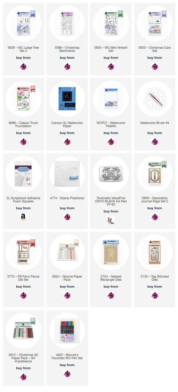 I used the sweet little truck from 5823 - Christmas Cars set, and stamped it in #N45 onto some Canson XL Watercolour paper. After pulling out the colour, I painted the truck with several layers of #837 to build up the darker areas, leaving the rounded parts of the truck much lighter. I masked off the back of the truck, and used my stamp positioner to stamp the tree from 5826 - WC Large Tree Set 2 in #249. After touching it with a damp brush, I stamped it a second time to add some of the detail back in. I wanted a wreath on the front of the truck, and the little half wreath from 5830 - WC Mini Wreath Set worked perfectly! I used #249 and my stamp positioner to get it in the right spot.