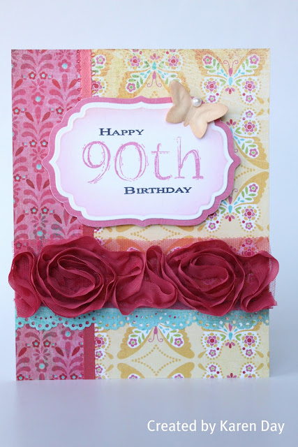 If I'm not mistaken, I believe that this is the 4th 90th birthday card that I've been asked to make this past year!  I wanted to do something bright & pretty, so I pulled out my Basic Grey Urban Prairie papers and my favourite pink rose ribbon: