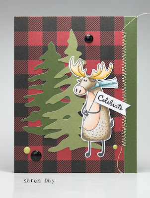 I of course, loved the buffalo plaid in the photo, along with all the little trees... and went with a moose instead of a bear or a fox. The moose is from the stamp set that matches the papers, and he's actually holding a Canadian flag, so I put a little "Celebrate" banner to cover the flag, and make it a little more birthday-appropriate.