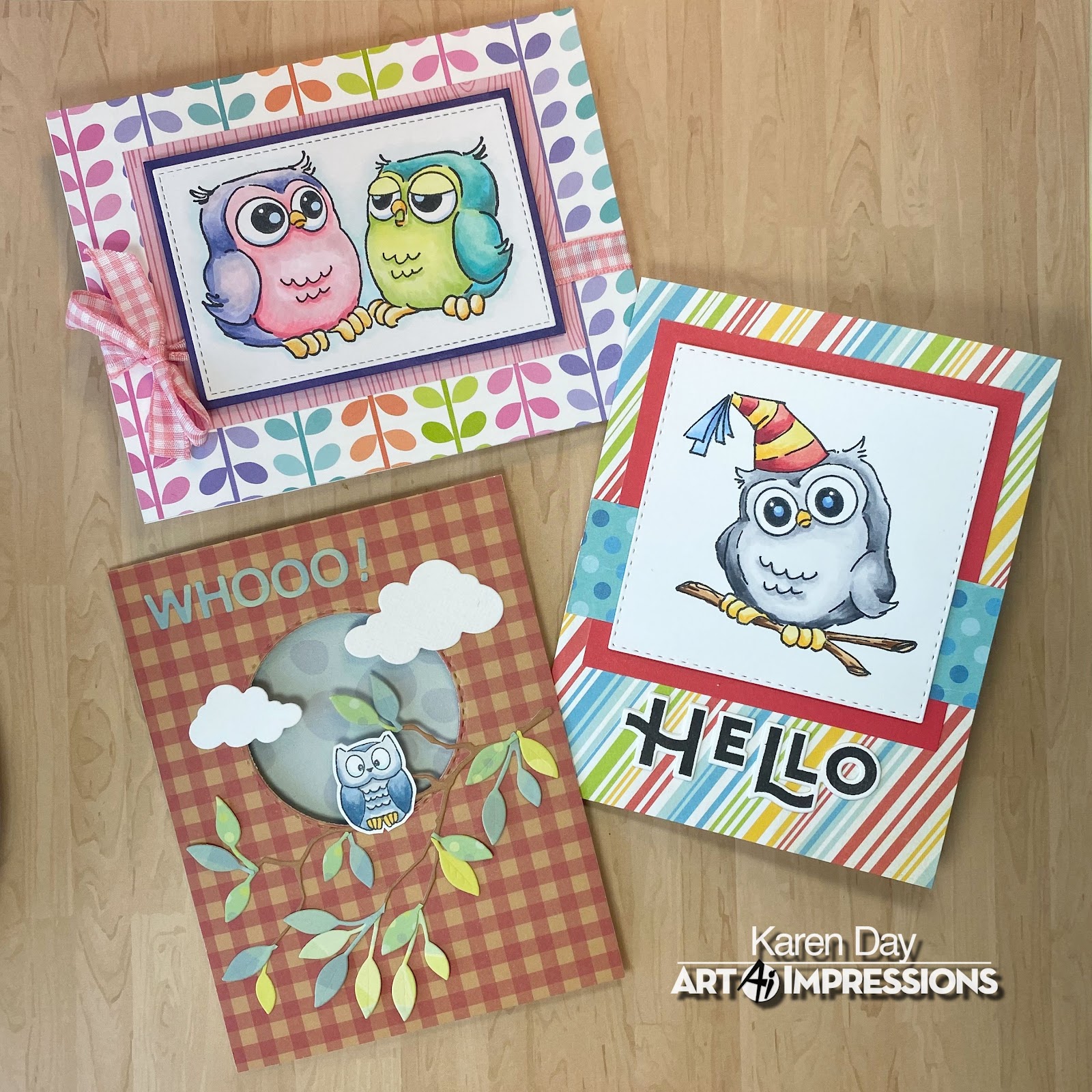 We have friends who have a granddaughter who is not quite two... that has a thing for owls! How cute. She mentioned that she had sent her an owl card in the mail, so I knew that I'd be diving into my craft supplies to find some images from Art Impressions that I'd stamped out years ago. Anyone remember the Whoots? I have two cards using the larger Whoot stamps (done in strong bright colours!), and I had one of the tiny Front & Back owls stamped out for my third card.